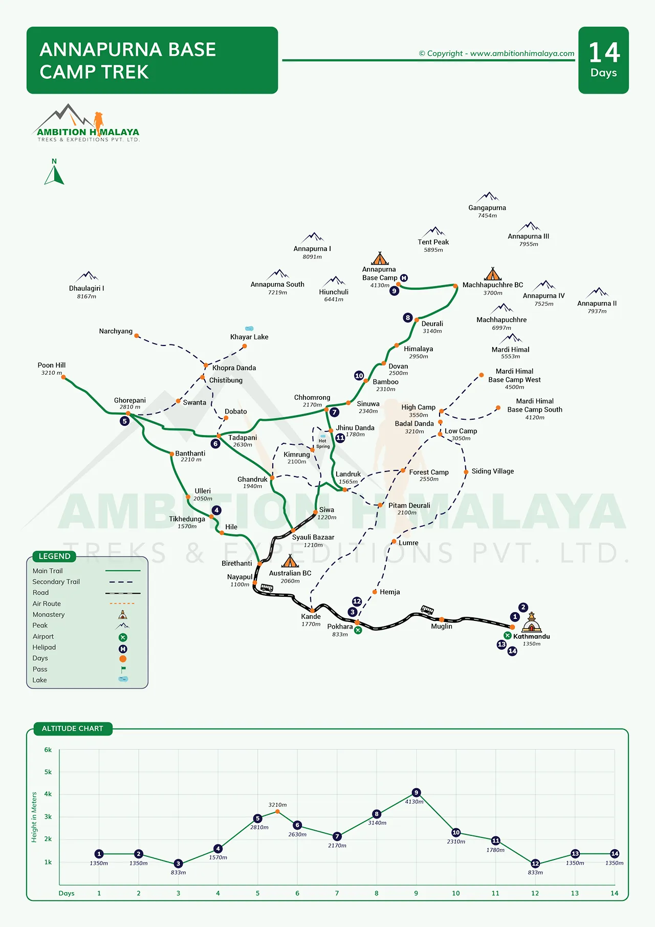 | 13 | Drive | Pokhara - Kathmandu | 1300 m | 6 / 7 hrs | Hotel | Breakfast |