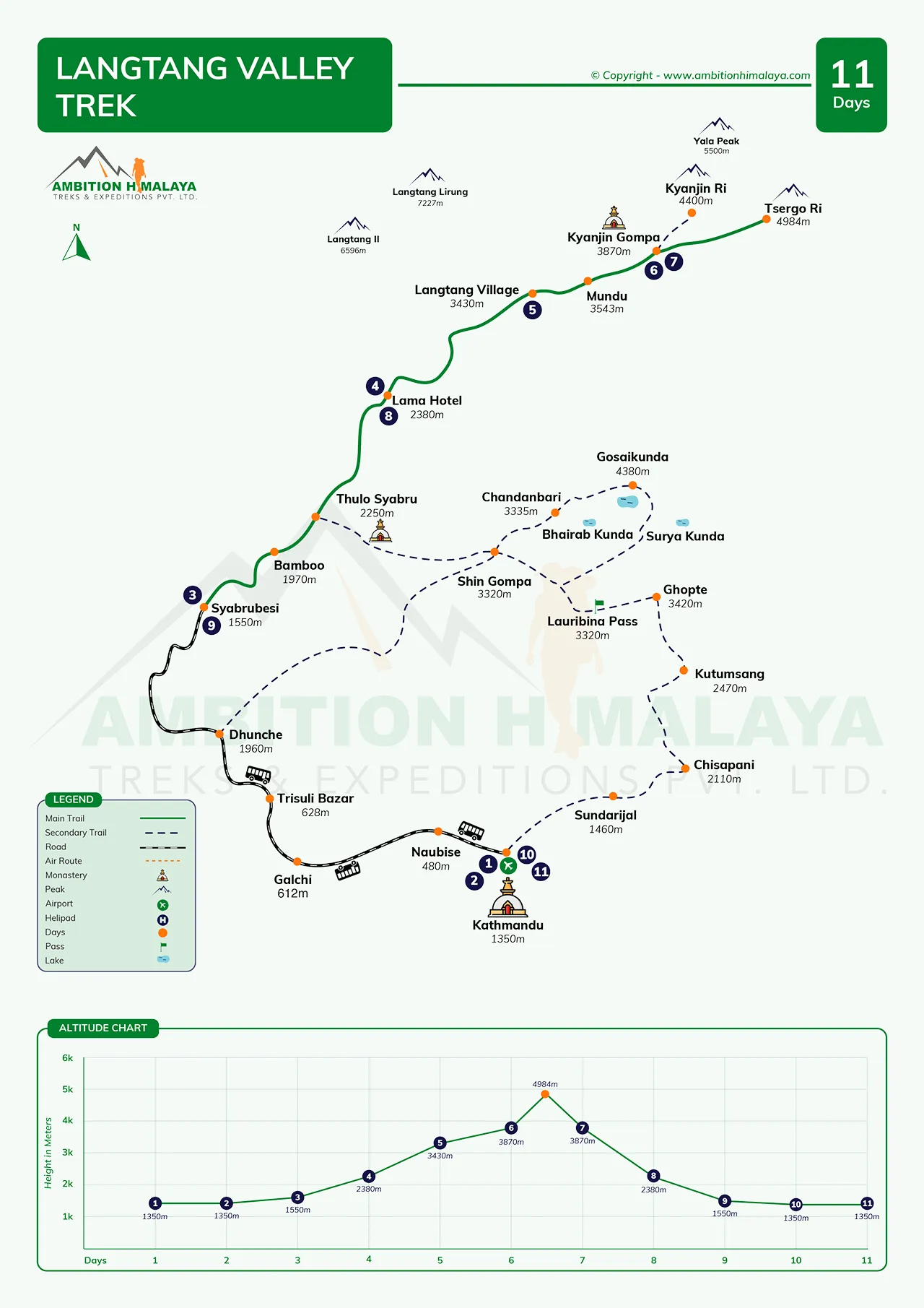 | 04 | Trek | Syabrubesi - Lama Hotel | 2,350 | 5/6 hrs | Guesthouses | B L D |