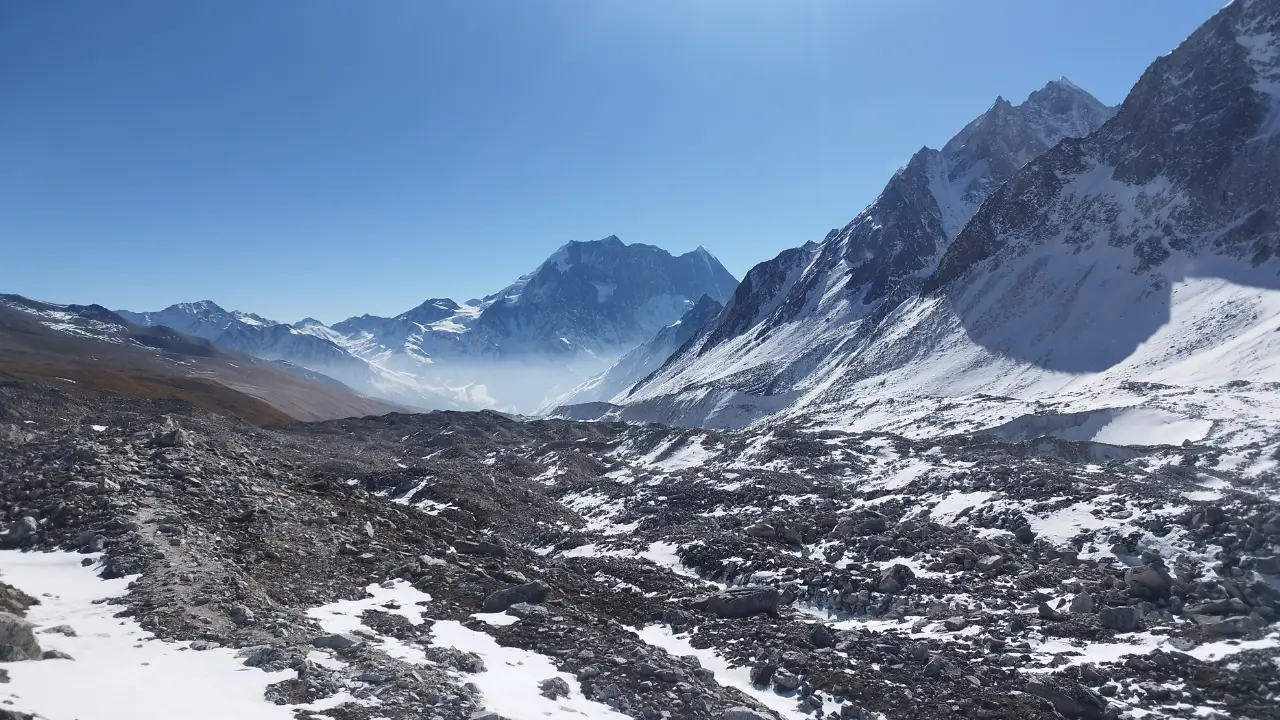 Our path will be more desert type from now on. Initially, we will hike up steadily through the wide grassy valley of Kermo Kharka. Then, we will progress along the base of the huge glacier tongue.