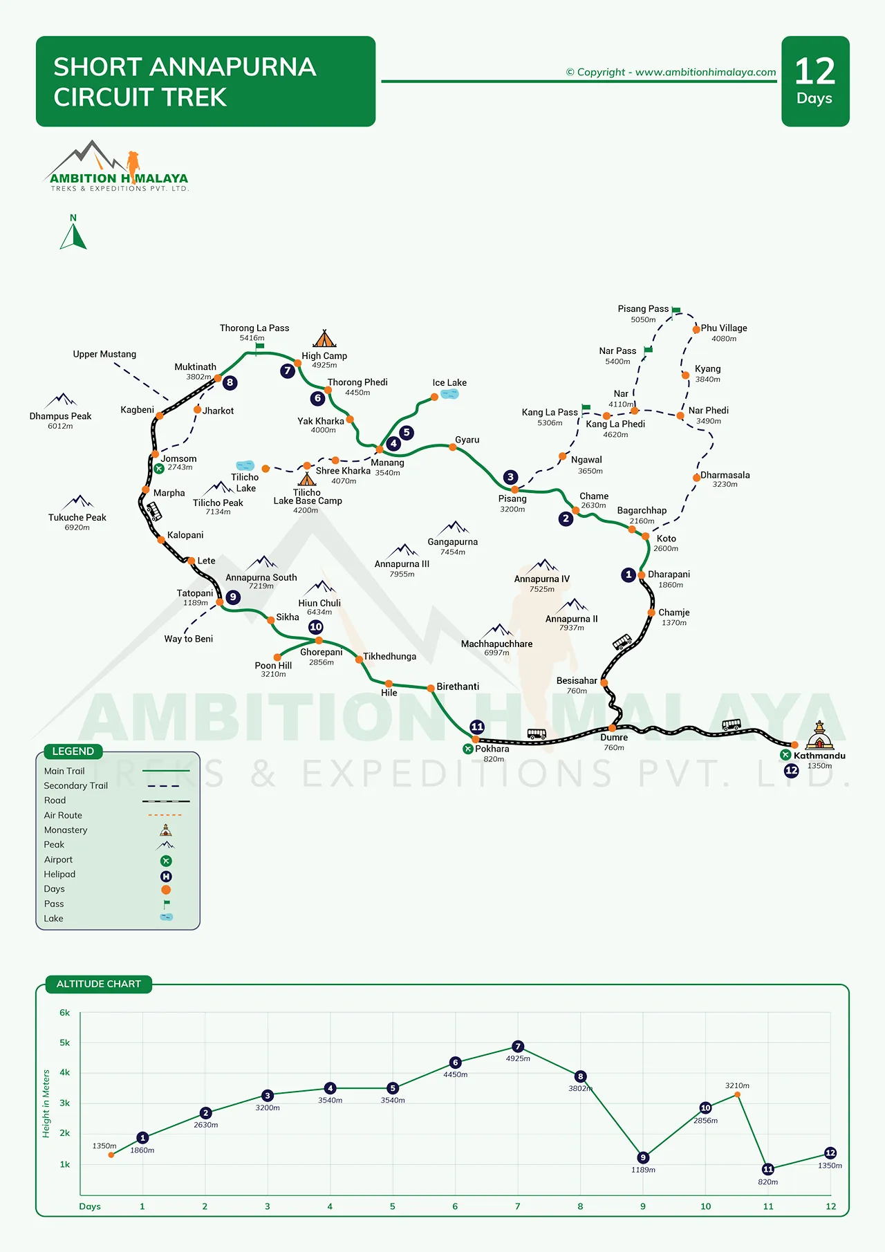 The overall Short Annapurna circuit trek is about 12 days and around 160 km in length. From Kathmandu, at an elevation of 1,300 meters from sea level, the trek carries on to the highest point at Thorong La Pass, at 5,416 m, before finally dropping down to reach Pokhara, lying at 820 m.