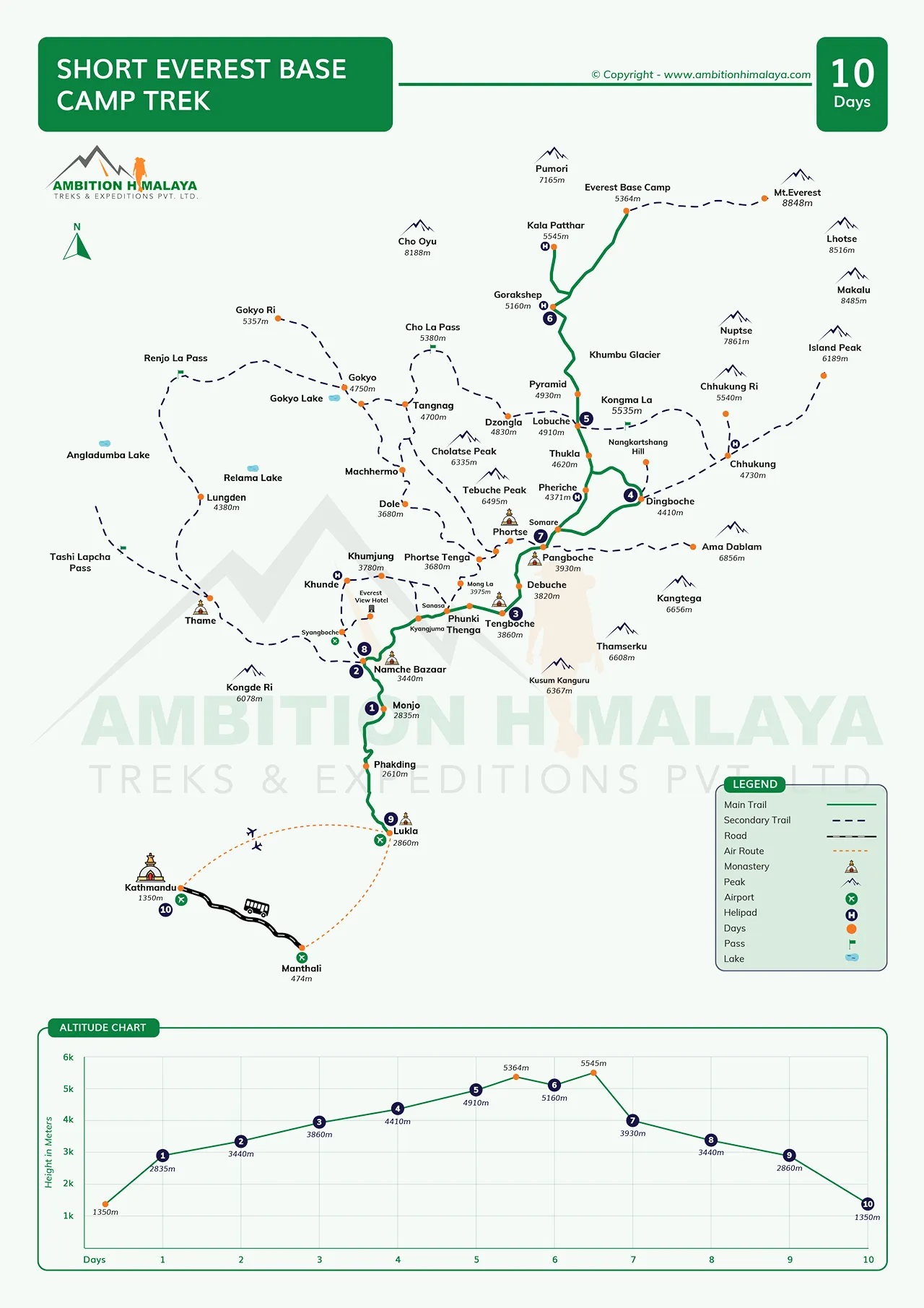The trek begins at an altitude of 2500m in Lukla and ends at 5,554m in Kalapathhar. The Short Everest Base Camp Trek is moderate to simple in difficulty. Thus one should be cautious of the altitude. Furthermore, the altitude climb from Namche Bazaar to Lobuche would be significant.