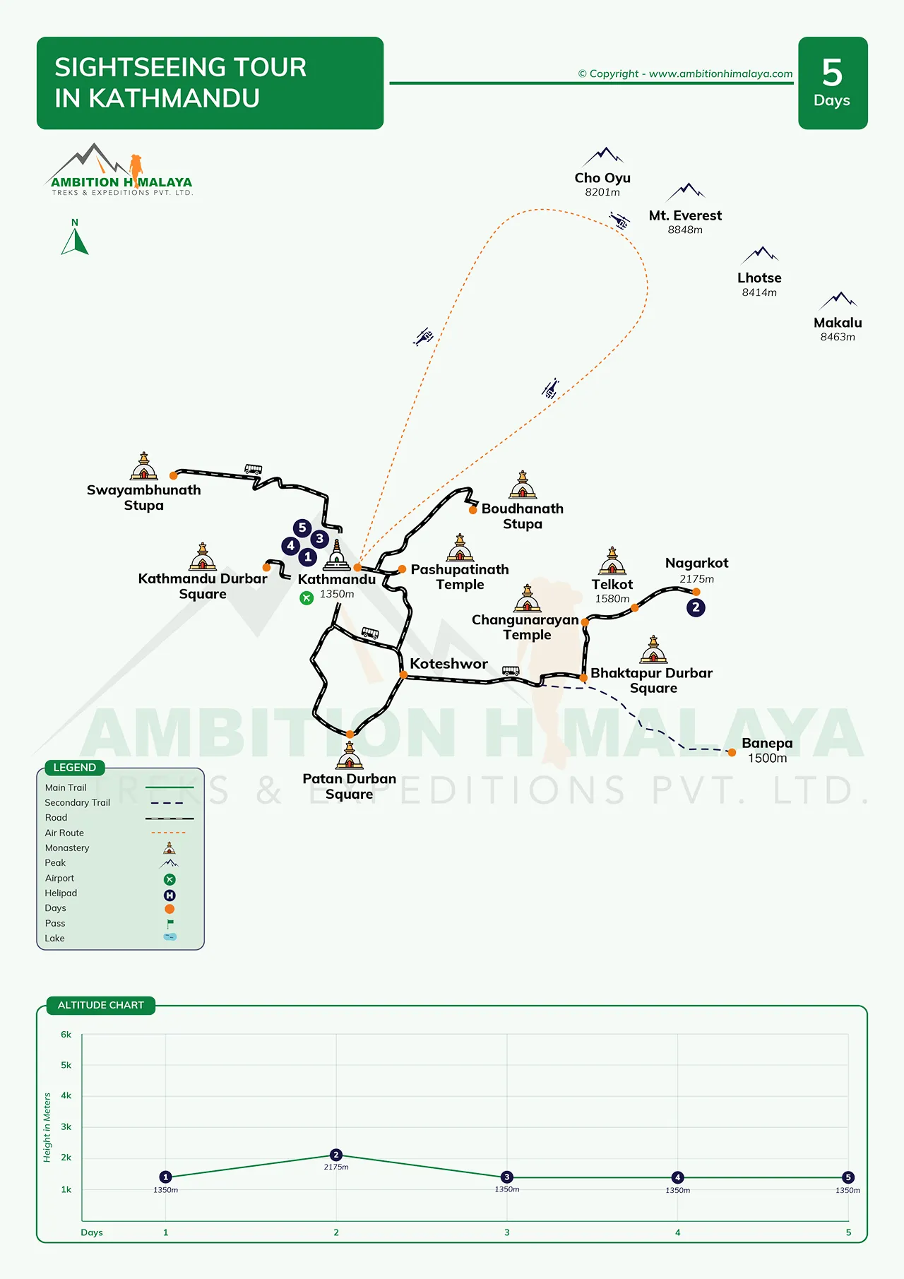 | 03 | Trek/drive | Nagarkot - Changunarayan - KTM | 1,300 | 4/5 hrs | Hotel | Breakfast |