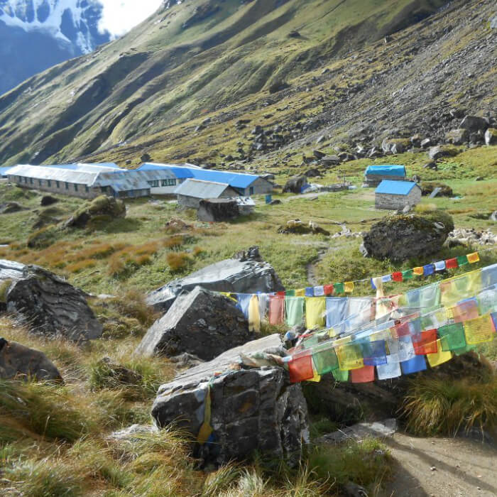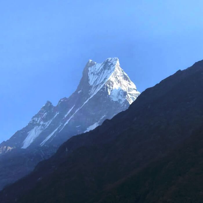 Our trek today will take us farther north as we awaken in the icy Himalayas. As we cross through rhododendron woodland, we will arrive at the trail that turns away from it and heads toward Machhapuchhre Base Camp.