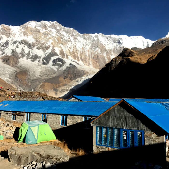 We will start walking after an early breakfast. First, we reach Machhapuchhre Base camp. We can have a cup of tea with views of Machhapuchhre, Annapurna, and Gangapurna within touching distance from here.